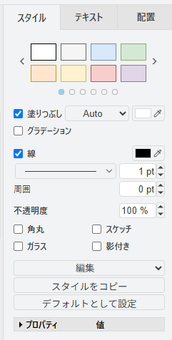 左側パネルから出したオブジェクトを選択すると、そのオブジェクトの書式(背景色、枠線など)の設定ができます。