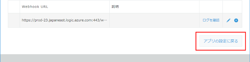 Webhook の設定画面に戻るので、右下の「アプリの設定に戻る」をクリックします。