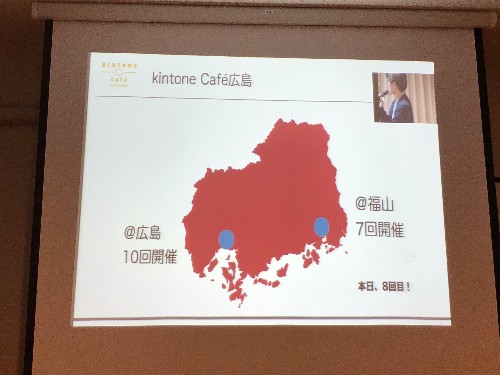 まずはkintone Café 広島運営メンバーのみっちゃんこと安藤さんのオープニングトーク。みっちゃん、広島からの移動です。同じ広島県ではあるんですが、広島県は横に長いので、福山と広島ってけっこう距離があります。