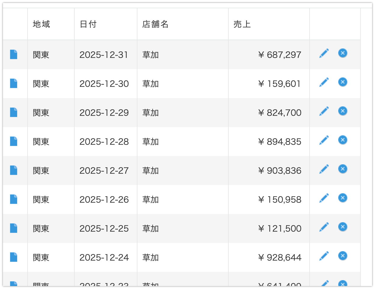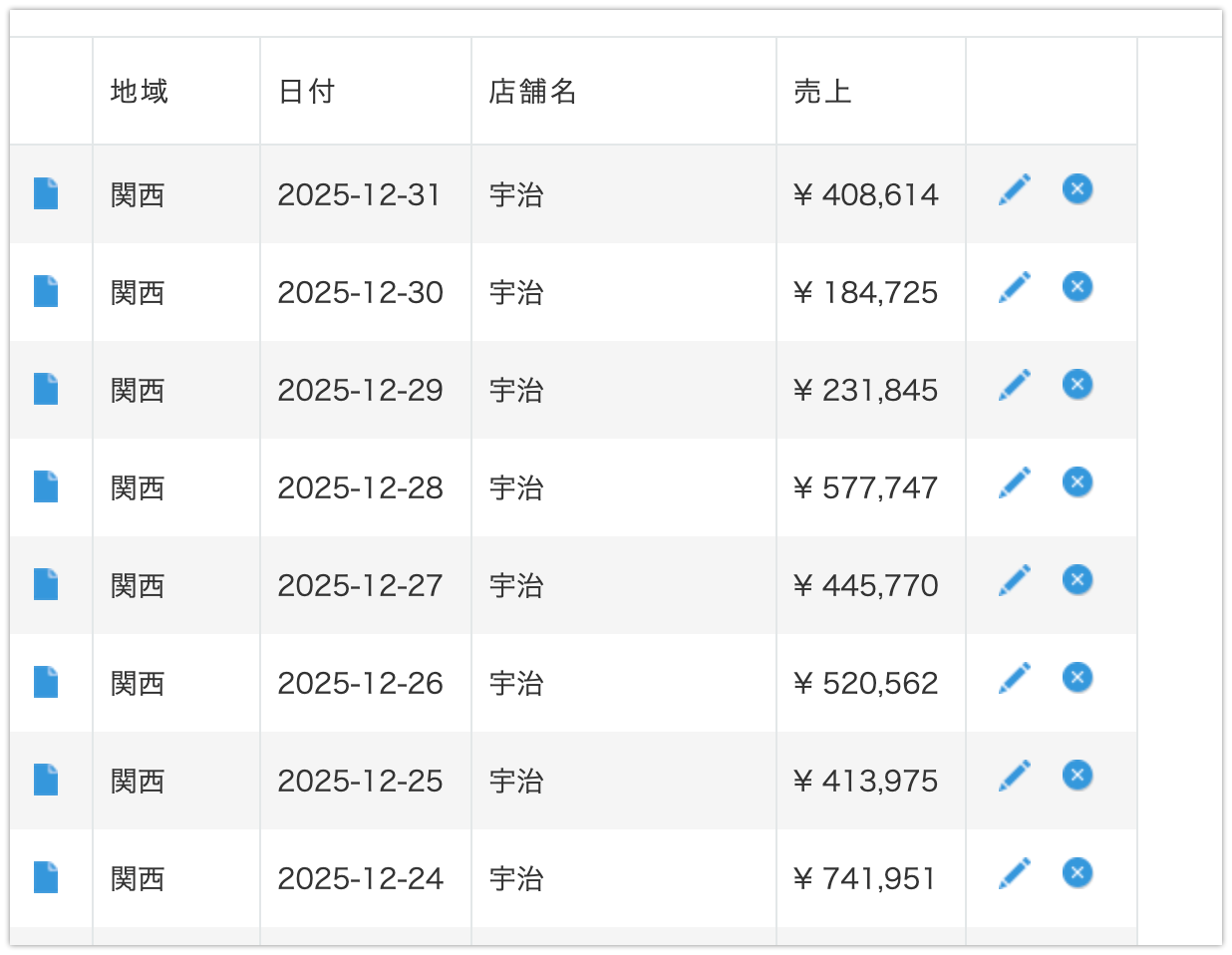 少し乱暴かつねつ造感のある例ですが、このような売上データのあるアプリがあるとします。このアプリには関東30店舗、関西30店舗の1年間の毎日の売上データが入っています。