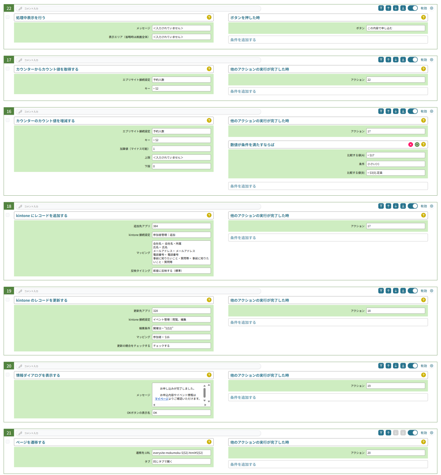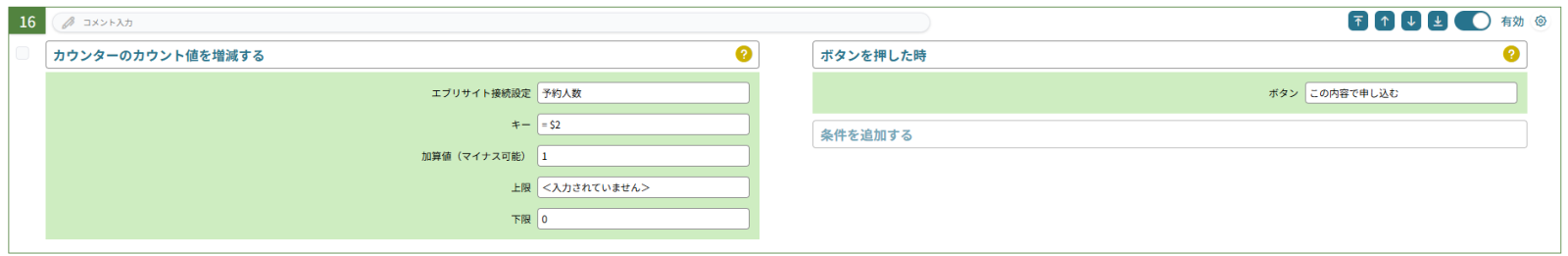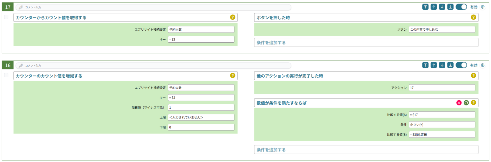 さて、アクション番号16番で予約人数のカウンターを用いて現在の予約人数が更新されたので、イベント管理アプリを更新します。