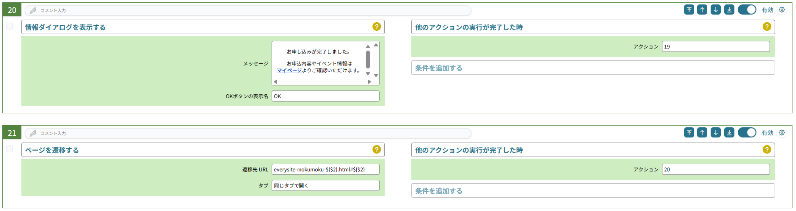ここまで来たら申し込みが完了したので、情報ダイアログを出して申し込み完了の旨を表示した後、ご自身が申し込んだイベント詳細ページに遷移する設定にしてみます。