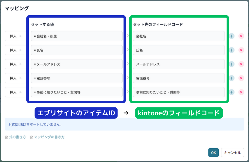 左側の「エブリサイトのアイテムID」に入力されている値を、右側の「kintoneのフィールドコード」のフィールドにセットします。