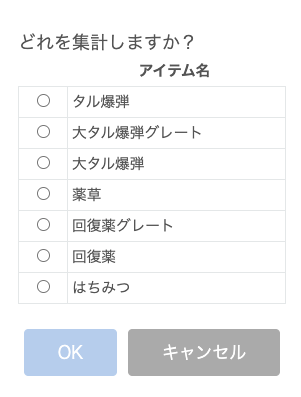 選択肢から選択するダイアログを表示する」を使ってどのアイテムを集計するか選ぶようにしてたんだけども、これは選択肢に表示するもの=アクションの結果になるのでアイテムコードをアクションの結果としようとすると、選択肢もアイテムコードになっちゃうんだよね〜。