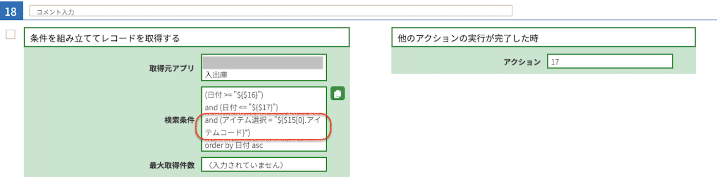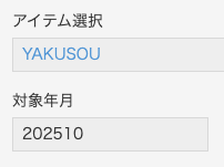 アイテム名を選択して、アイテム名をキーに入出庫アプリのレコードを取得してるんだけど、本当はアイテム名じゃなくてアイテムコードで取得するべきだよね。キーだもんね。