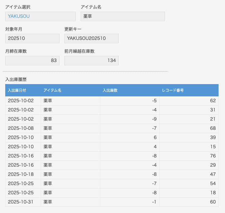 棚卸し集計アプリを作って、前月分の入出庫レコードを集計して、前月の在庫数と合わせて合計を出すことはできました。