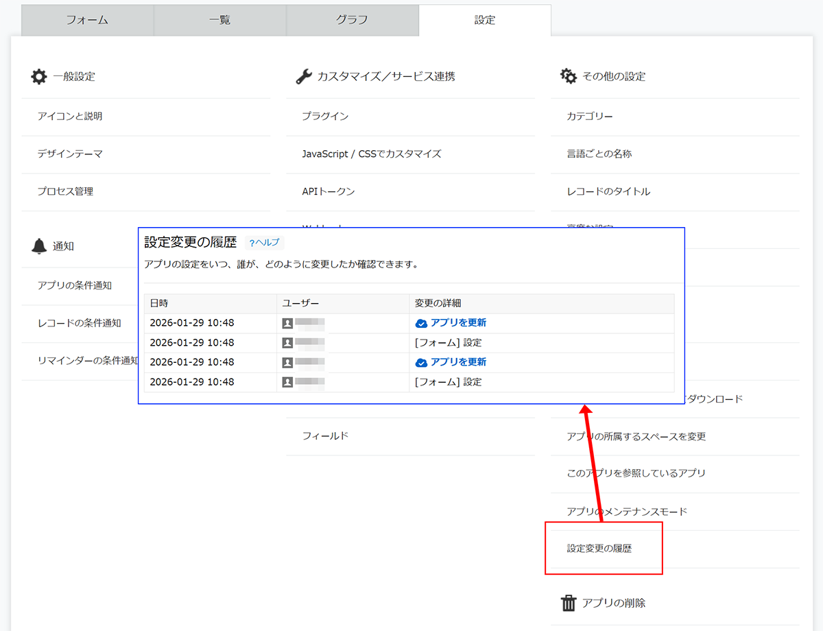 アプリ設定で、これまでの設定変更の日時・ユーザー・変更が行われた画面を確認できるようになりました。これにより、例えばアプリが自分の覚えのない設定になっている場合に、「設定変更の履歴」画面を確認し、該当の変更を行ったユーザーを把握して詳細を確認したり、変更日時以降に登録されたレコードを確認したりする、といった利用が可能となります。