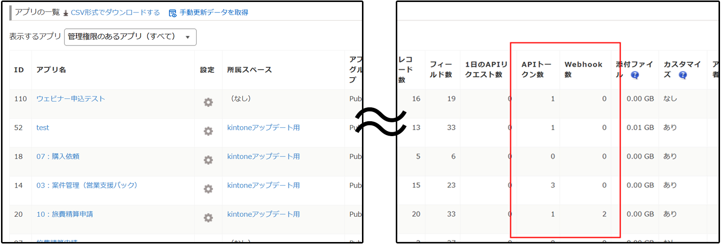 kintoneシステム管理のアプリ管理画面に改善がありました。 アプリ一覧の項目に、新しく「APIトークン数」と「Webhook数」の列が追加されています。