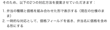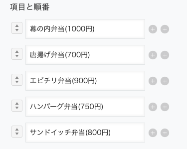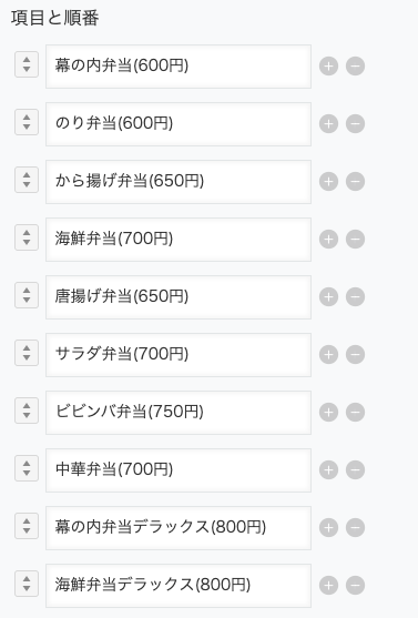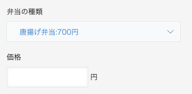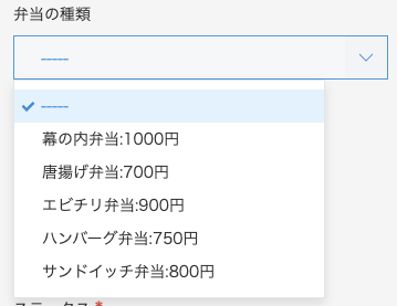 ちなみに、弁当メニューはドロップダウンで全部埋めてくれてました。 こういう選択肢がいくつかあるものを作ってくれるのは結構楽で良いです。