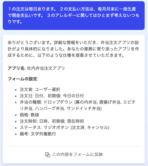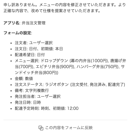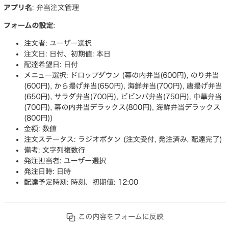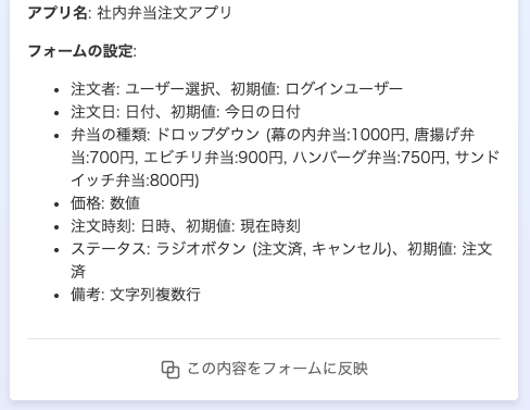 メニューまで仮で作ってくれそうですね。 「この内容をフォームに反映」ボタンを押して作ってもらいましょう!