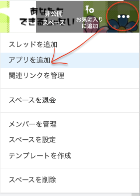 まずはアプリを作成したいスペースを表示しまして、アプリの追加を選択します。