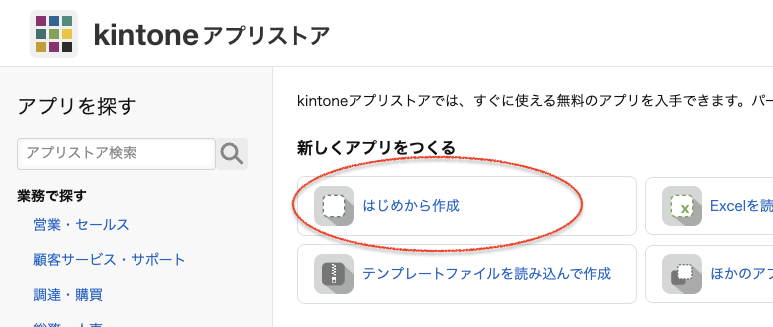 アプリストアが開かれると思うので、「はじめから作成」ボタンを押して新規アプリのフォーム設定画面まで行きます。