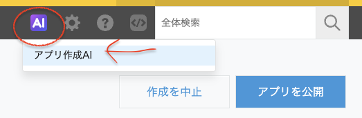 ここまできたら、右上の方にある「AI」ボタンを押して、「アプリ作成AI」を選択します。