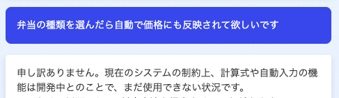メニューのところに値段も増えたんですけど、、、選んでも金額の方には何も反映されませんでした。計算フィールドを使えって指示したらいいのかな…いやでもそこまで指示するのは負けた気がする。AIに計算フィールドを使うことに気づかせたい笑
