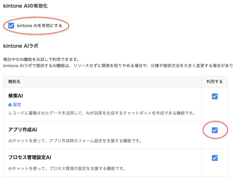 今回はさらに「アプリ作成AI」の「利用する」にもチェックをつけます。