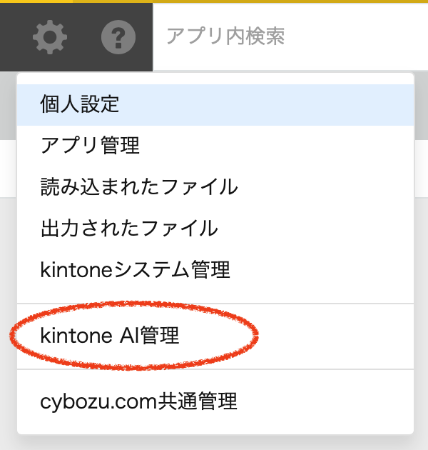 kintoneを開いて、右上の歯車から「kintone AI管理」をクリックします。