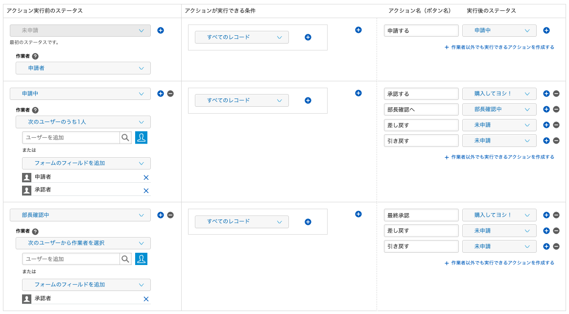 1つの「アクションが実行できる条件」の枠に「実行後のステータス」が全部設定されていたりするけど