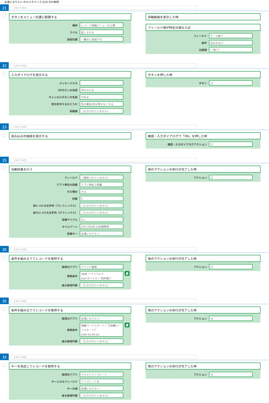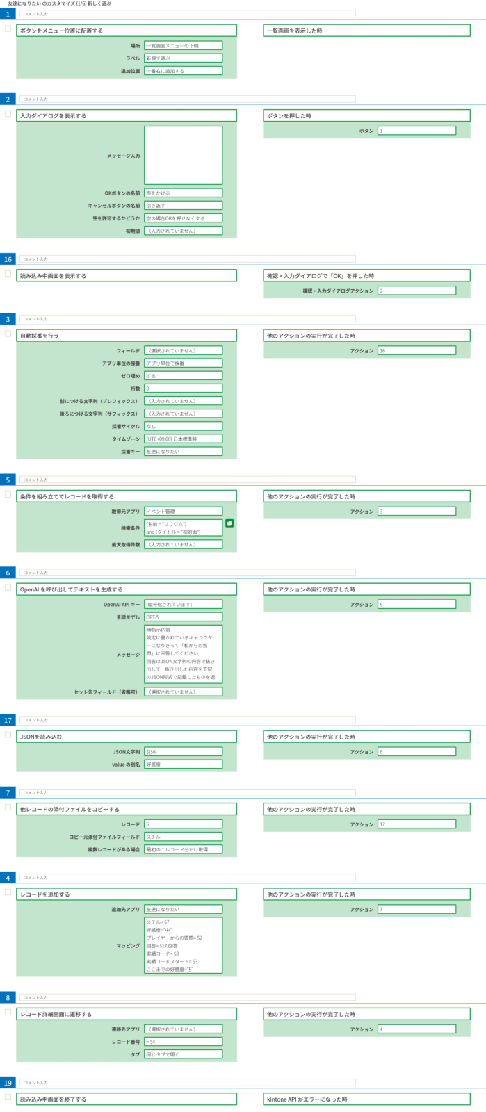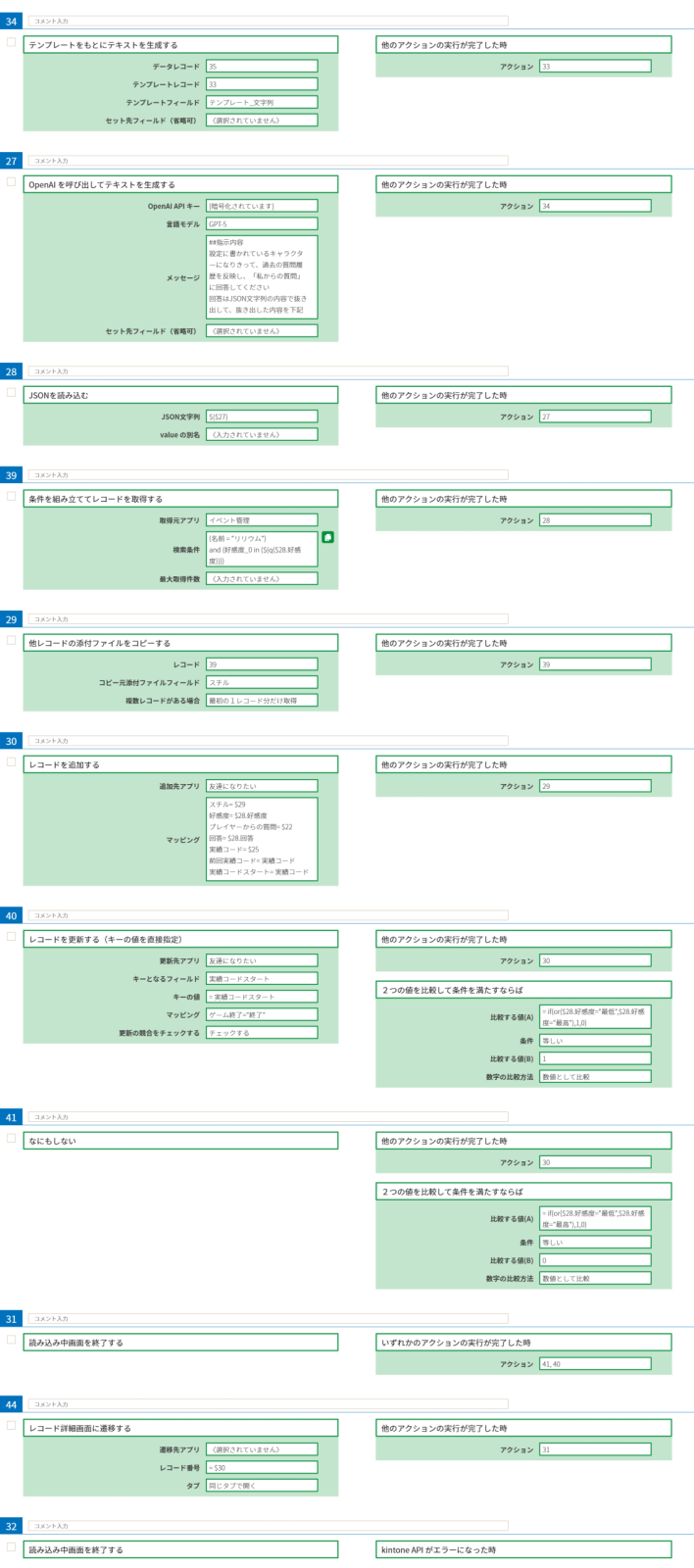 こちらは、過去の会話履歴をkintoneから取得し、やること「 テンプレートをもとにテキストを生成する」で整えてからOpenAI渡します。