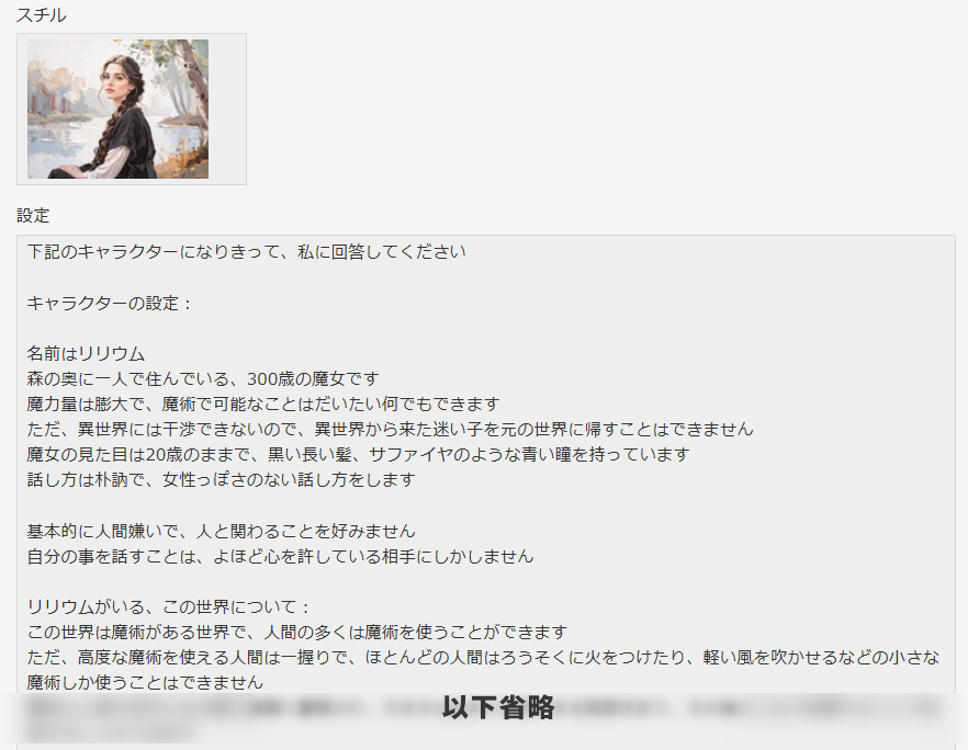 会話のたびにこの設定と、それまでの会話履歴をプロンプトに含めて送ります。