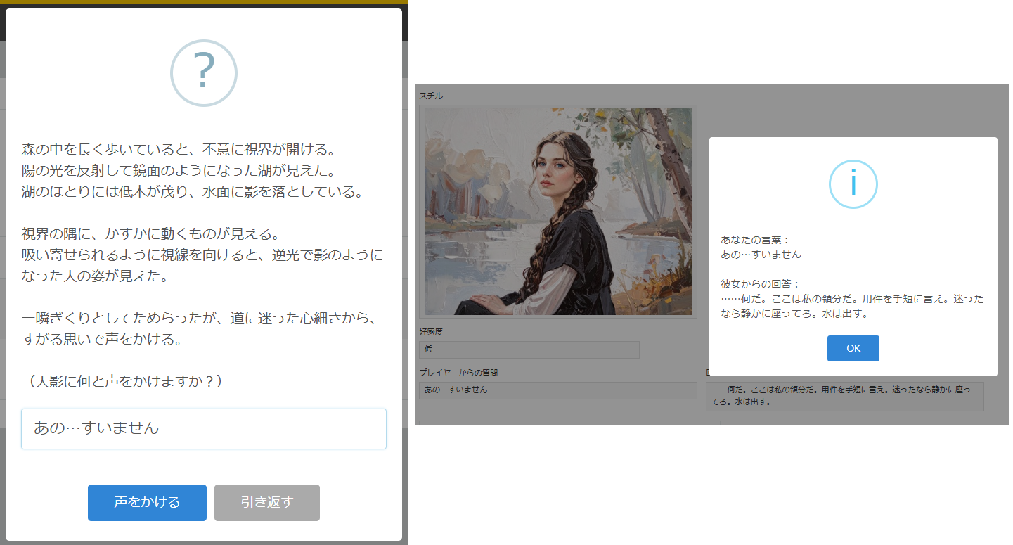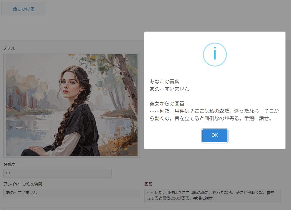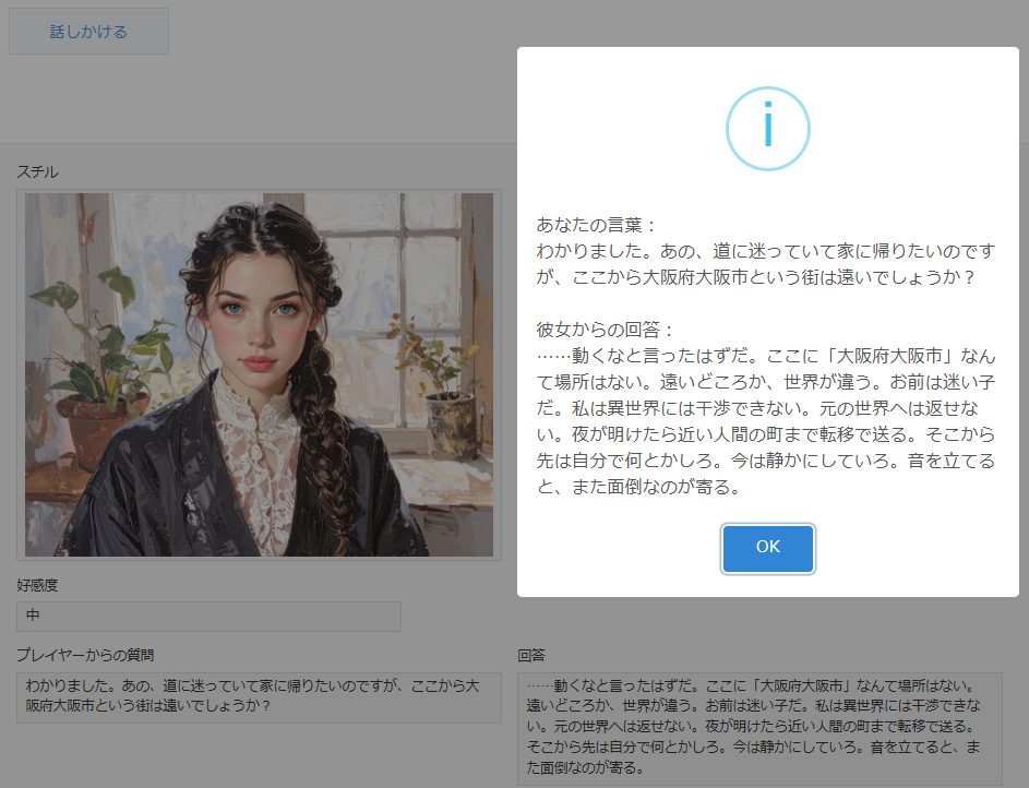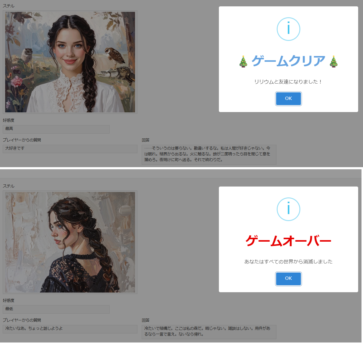 会話を繰り返し、好感度が「最高」または「最低」になればゲーム終了です。