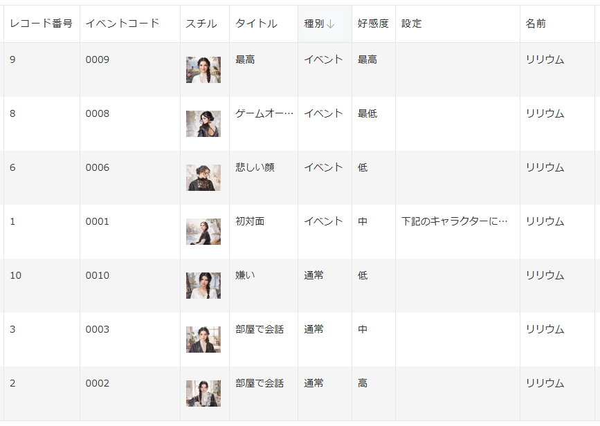 「初対面」のレコードに、後述のキャラクターの設定と世界観を設定しました。