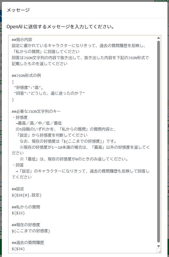 あらかじめ登録しておいた設定と、ダイアログで入力された声掛けをもとに、やること「OpenAI を呼び出してテキストを生成する」を呼び出します。