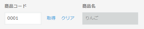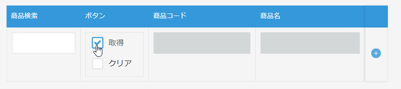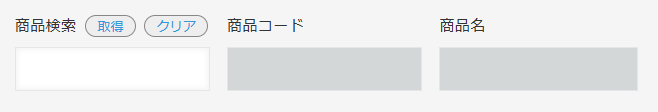 商品検索フィールドが検索ワードを入れるためのフィールドなので、「取得」「クリア」ボタンは「商品検索」フィールドに設置しましょう。「ボタンをフィールド名の右に配置する」を使えば省スペースになります!