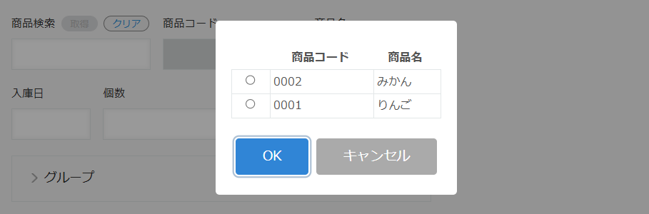 - 検索ワードを入力せずに「取得」ボタンを押した場合、レコードを全て取得しポップアップで表示、選択したら各フィールドにコピー