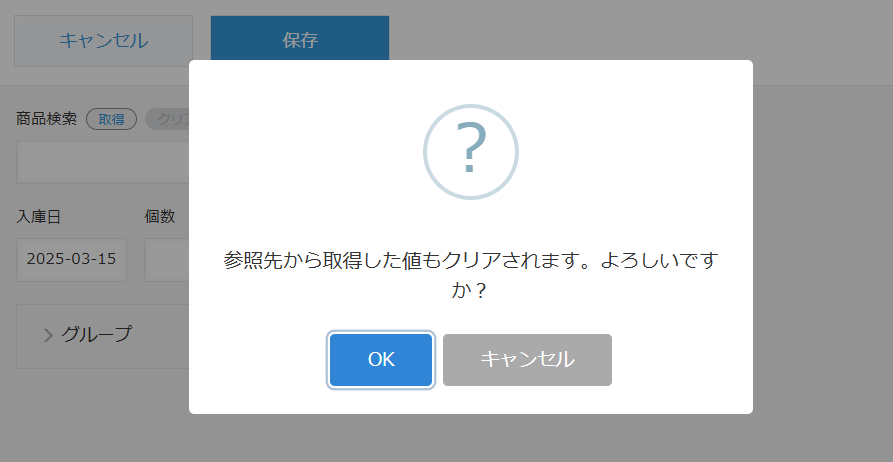 「クリア」ボタンは、押すと「参照先から取得した値もクリアされます。よろしいですか?」という確認ダイアログが表示され、OKを押すと各フィールドの値がクリアされます。