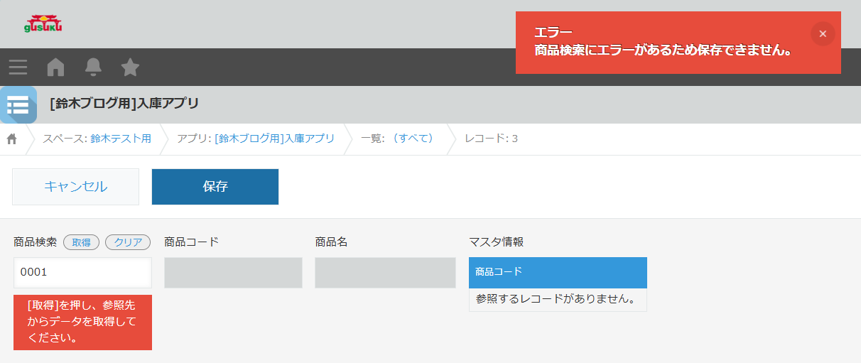 基本機能のルックアップには、ルックアップフィールドの値を編集した場合、「取得」か「クリア」を押さないとレコードを保存できないようにエラーを出す、という機能があります。つまり、ルックアップで取得したレコード情報とルックアップフィールドの値が食い違うのを防いでくれる仕組みです。