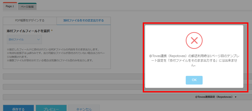 ちなみに、郵送の設定で、1ページ目に添付ファイルフィールドを指定しようとすると以下のようにエラーになります。
