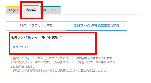 2ページ目の設定では添付ファイルフィールドを指定できます。