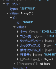 こちらが、詳細画面のコンソールログで、kintone.app.record.get()をした内容です。