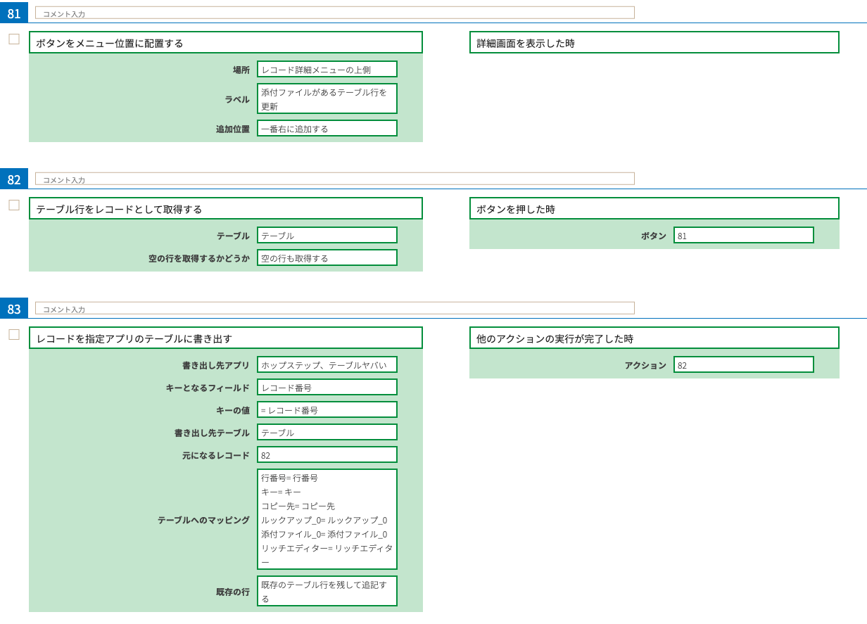 上記のブログでは主に編集画面での一般的な動きだったので、今回は編集画面で特殊なケースと、別レコードのテーブル操作を取り上げてみたいと思います。他レコードの操作は「やること」を組み合わせて作成する事が多いのと、画面に表示されていないものを操作するという動作になりイメージしにくいという点にご注意ください。