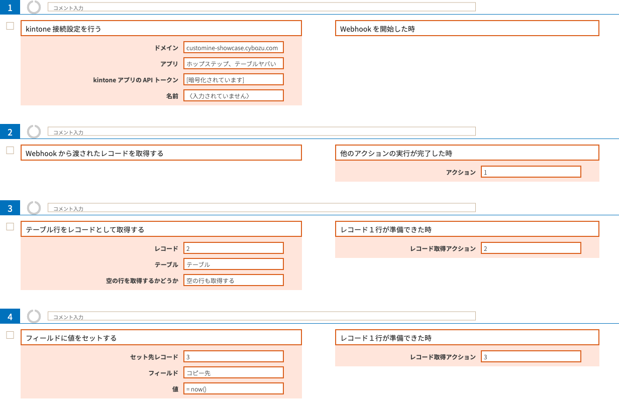 コピーがレコード追加だけであれば次のページのように「テーブルデータをセットしたレコードを追加する」を使うことでアクションを減らすことも可能です。