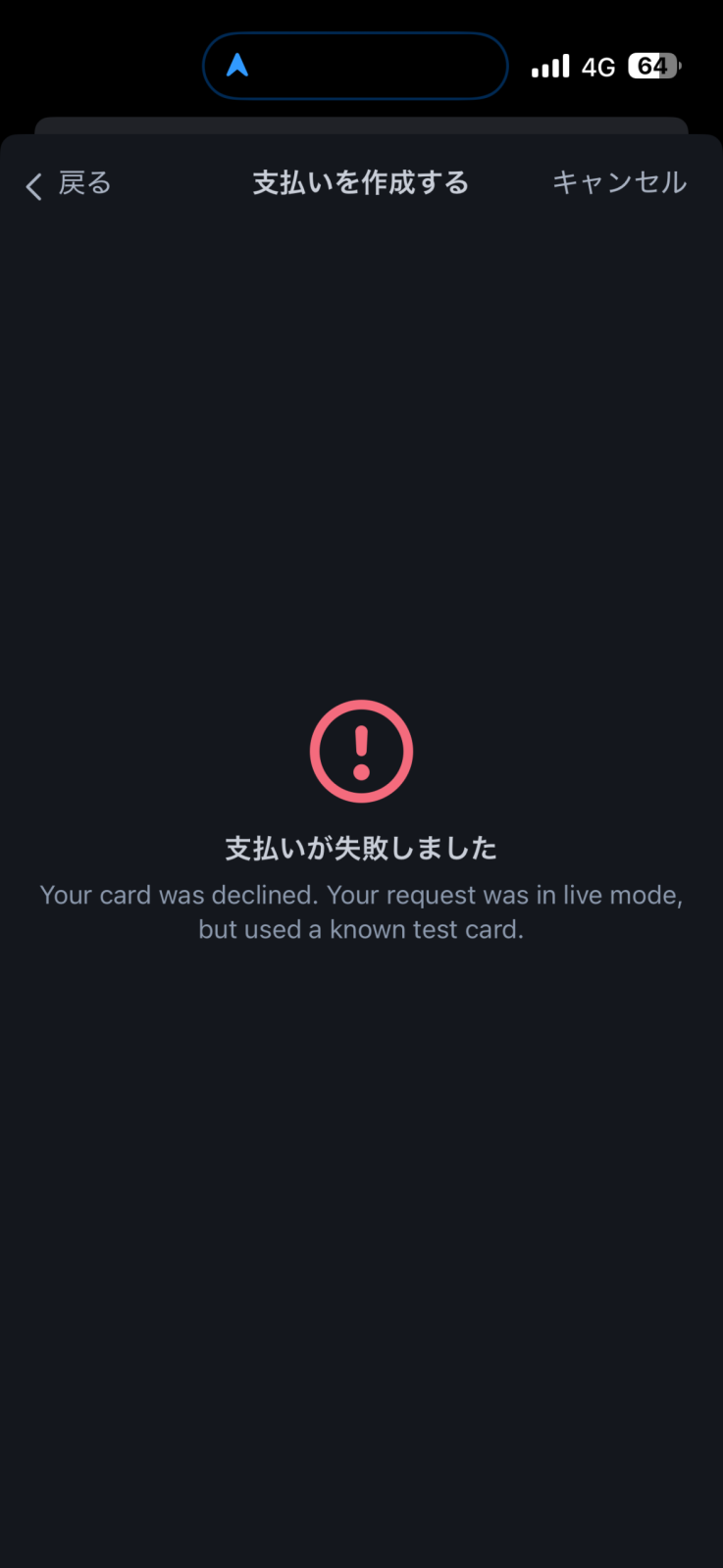 テストで決済失敗するとこんな表示です。なんというか、物理決済の動作確認のためには使えないカードを用意ということも必要なんですね。