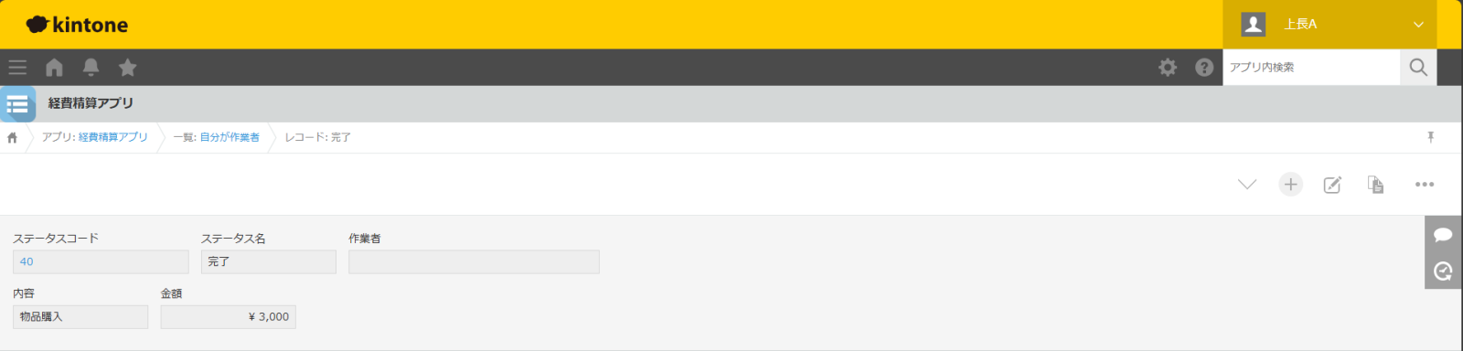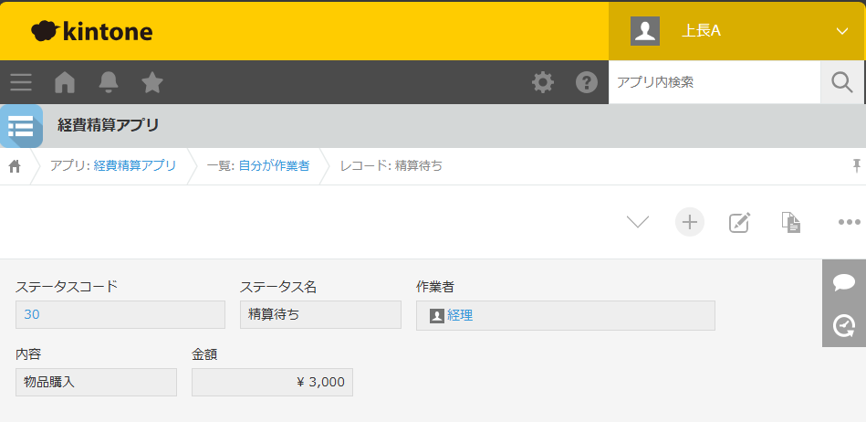 上長A:レコードの更新(ステータスを「精算待ち」へ変更)
