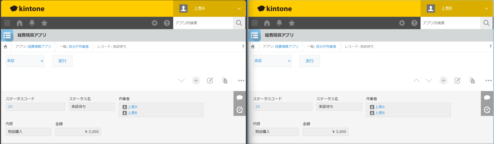 このレコードを、上長Aと上長Bがそれぞれのパソコンの画面上で表示しているとします。