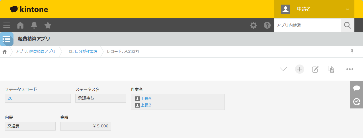 先ほど自分が開いていたレコードの画面を見ると、上長Aの画面では、ステータスがまだ「承認待ち」のままです。