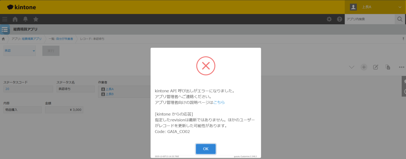先ほどのお昼休憩から帰った上長Aのケースでは、「実行」ボタンを押した際にこのチェックに引っかかり、以下のようなエラーダイアログが表示されます。