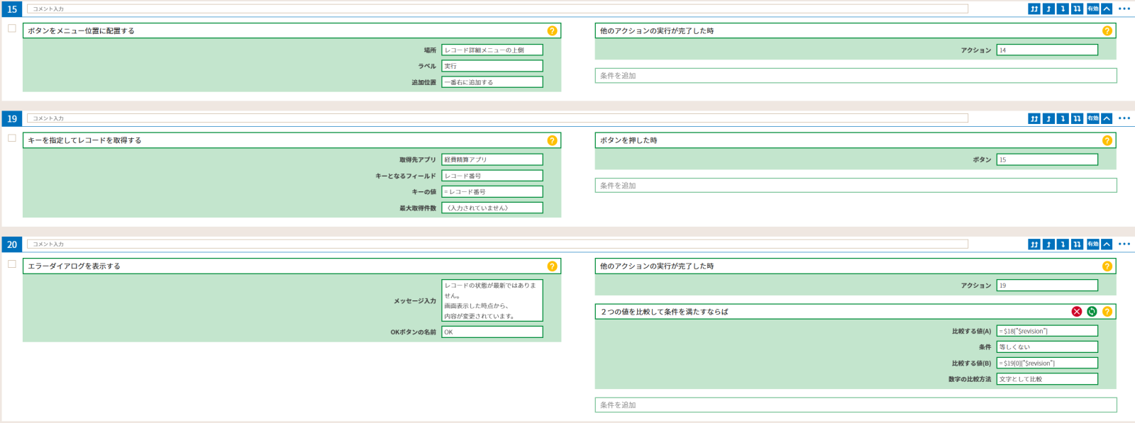 2つの値を比較して条件を満たすならばを使って、画面表示時のレコードのリビジョンと、ボタンを押した後に改めて取得したレコードのリビジョンを比較し、不一致の場合はエラーダイアログを表示しています。