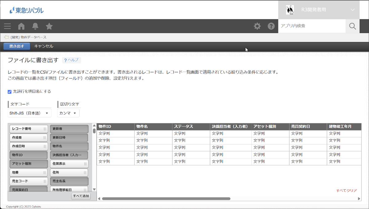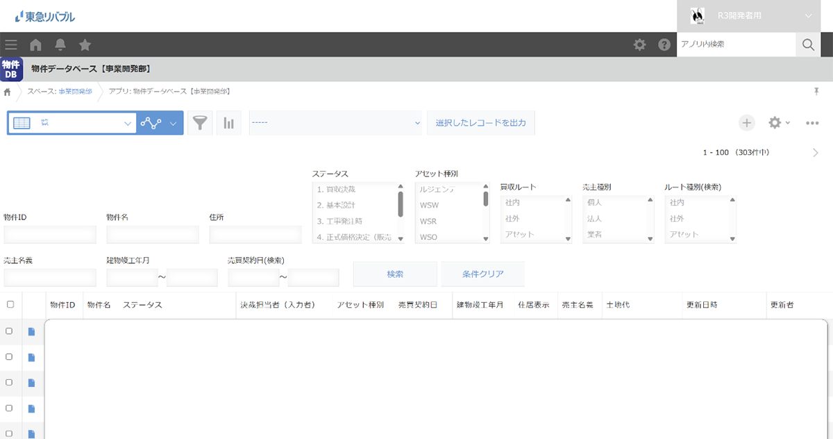 今回開発したのは「物件データベースアプリ」です。ステータス毎に、当社の事業物件データを管理することができます。
