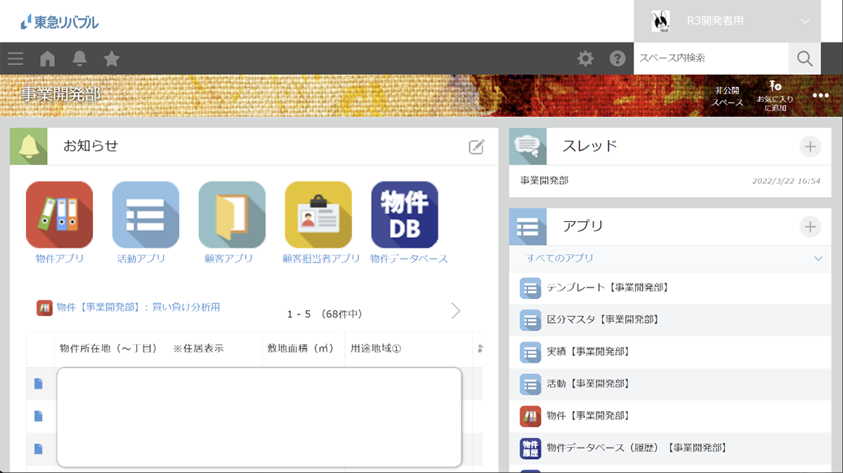 東急リバブル株式会社のアセット事業本部は、不動産開発、販売、運営を総合的に手掛ける部門です。同部門はこのたび、自社開発物件の実績とその開発中のデータを一元管理するためのアプリをサイボウズ社のkintoneで構築されました。同アプリには、データを管理する仕組みのほか、地図に複数の物件データをボックス表示させ、そのデータを地図上で自由自在に動かすことができる機能をアールスリーの開発により実現しています。本インタビューではアプリ企画の立ち上げの経緯や導入による効果について、本案件を担当された稲垣様と内山様にうかがいました。