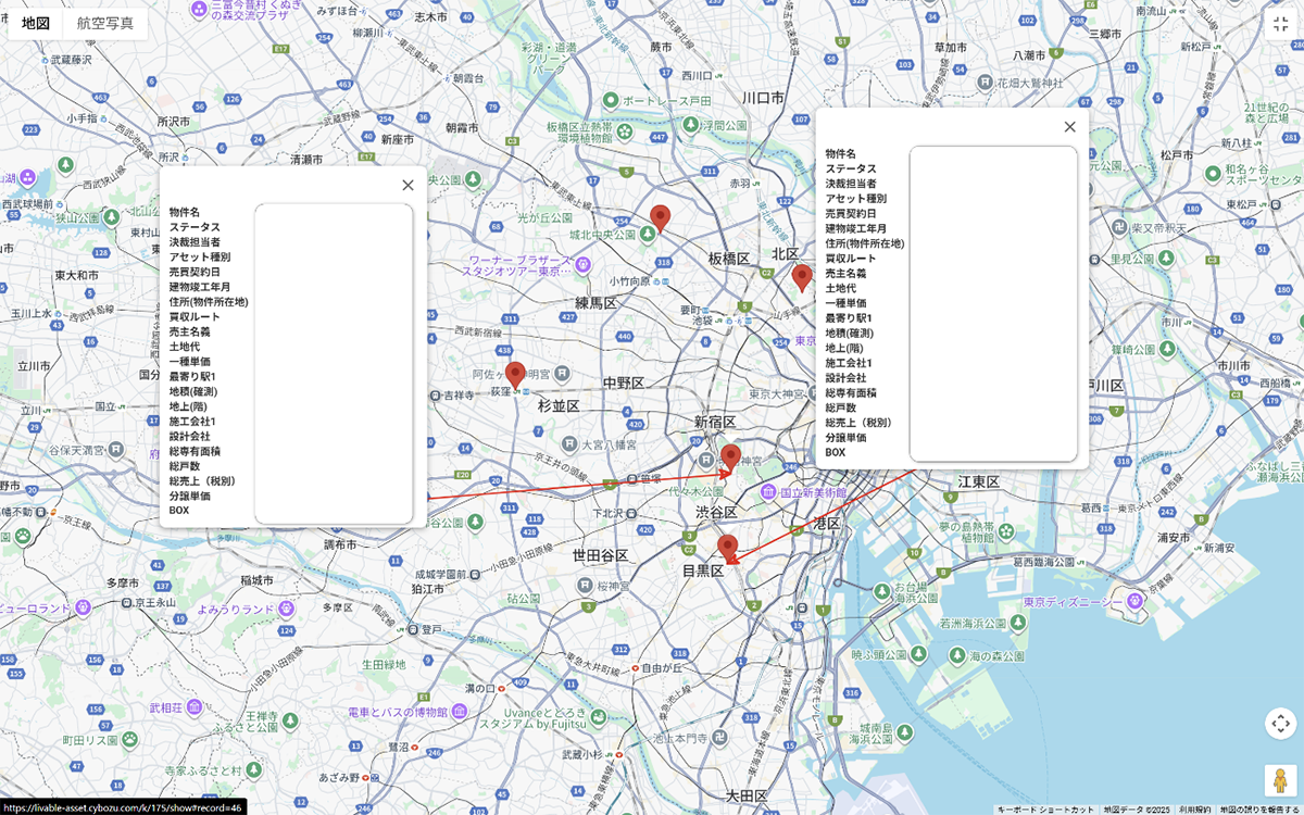 具体的には、地図上で開発物件の住所に赤いピンが立ち、ピンをクリックすると物件概要がデータボックスに表示されるので、物件の現在のステータス、購入金額、工事費用など重要な情報がひと目でわかります。特に新入社員、当本部への異動者は、まず自社物件を把握していきますが、この地図を開きながら歩けばすぐに目的の場所がわかりますし、現地で物件の詳細も閲覧できます。近くにある他の物件を効率よく確認することも容易になりました。