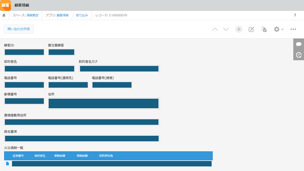 8万件を超える顧客情報を、kintoneでデータベース化しました。これまでExcelで分散管理していた情報を一元化できた点が、今回の最大の成果です。まず、既存の8万数千件の顧客データをkintoneに取り込み、以降は損害保険会社から毎月届く更改リストをアップロードする運用に変更しました。1レコードが1顧客に対応しており、基本情報・契約中の保険内容・過去の問い合わせ履歴などをひとつの画面で確認できます。また、顧客とのやり取りや対応履歴をkintoneに残せるようになったことで、問い合わせがあった際には検索機能で即座に情報を参照可能になりました。以前は、申込書の控えに付箋でメモを残し、その資料を探し出して対応していたため、現在は業務スピードが格段に向上しています。