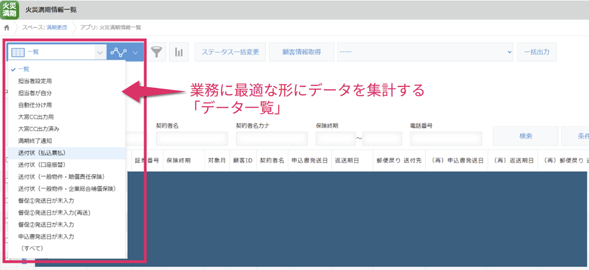 業務に合わせて最適な形でデータを抽出できる「データ一覧」