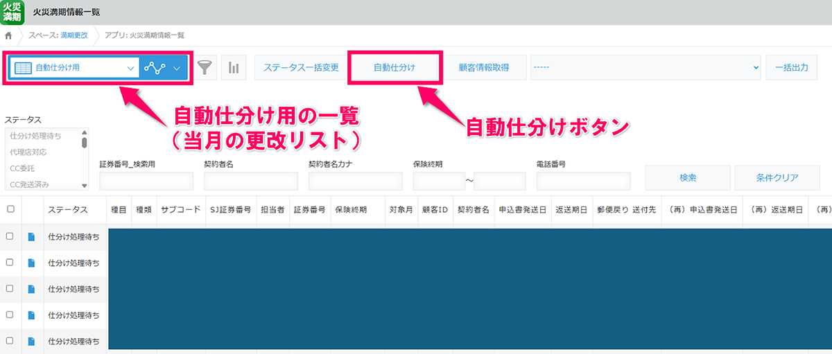 損害保険会社から受け取ったデータは「自動仕分け用」一覧に格納され、自動仕分けボタンを押すと代理店対応か委託先対応かの仕分け処理が実行される