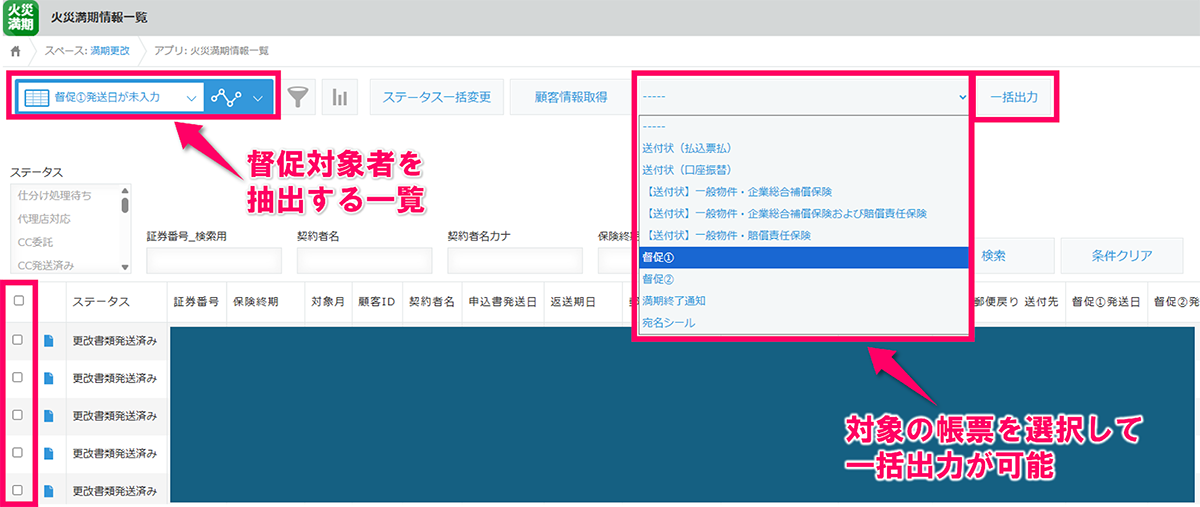 督促案内の対象レコードを抽出する画面。右上で案内状や宛名シールなどのパターンを選び、帳票の一括出力が可能