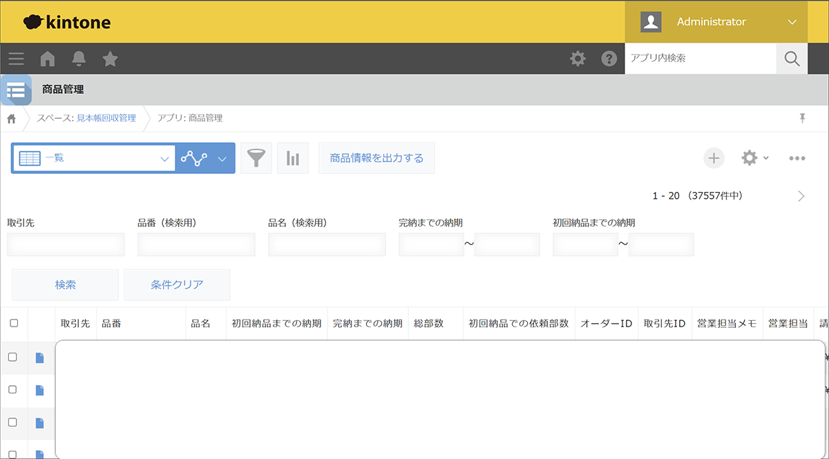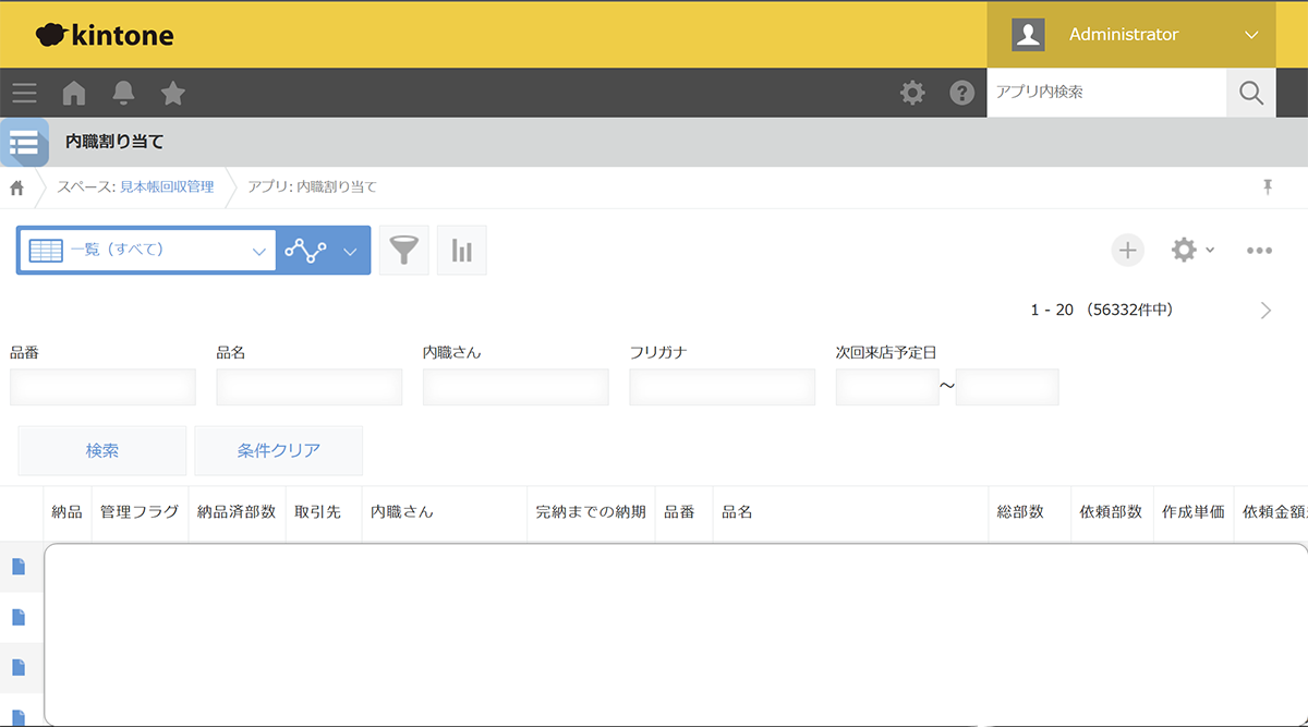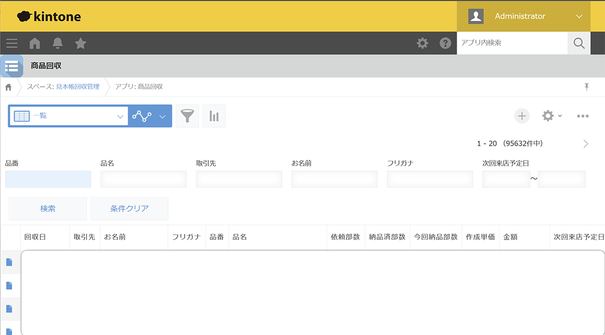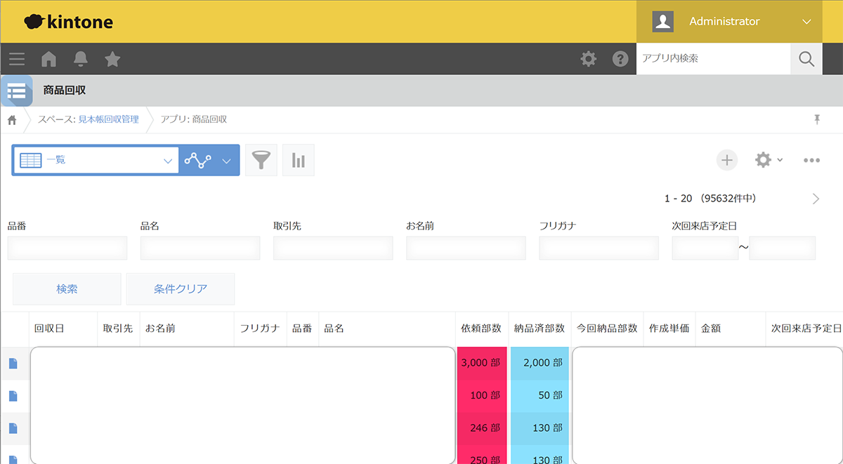 特に「商品回収」は当社の独特な事情がうまくアプリに反映されています。例えば1つの仕事では台紙は数回に分けて分納されるので。過去の同一の依頼分がアプリの中で自動で足し算されてレコードに反映されるようになっています。例えばアプリのレコード一覧を見れば「仕事Aは規定数150枚に対し、納品回数は2回で、累計104部納品済み」という具合に現状を一目で把握できます。おかげで発注者さまから「急いで納品してほしい」とお問い合わせが入った時にはすぐに現状を報告したり急ぎの対応をしたりできます。