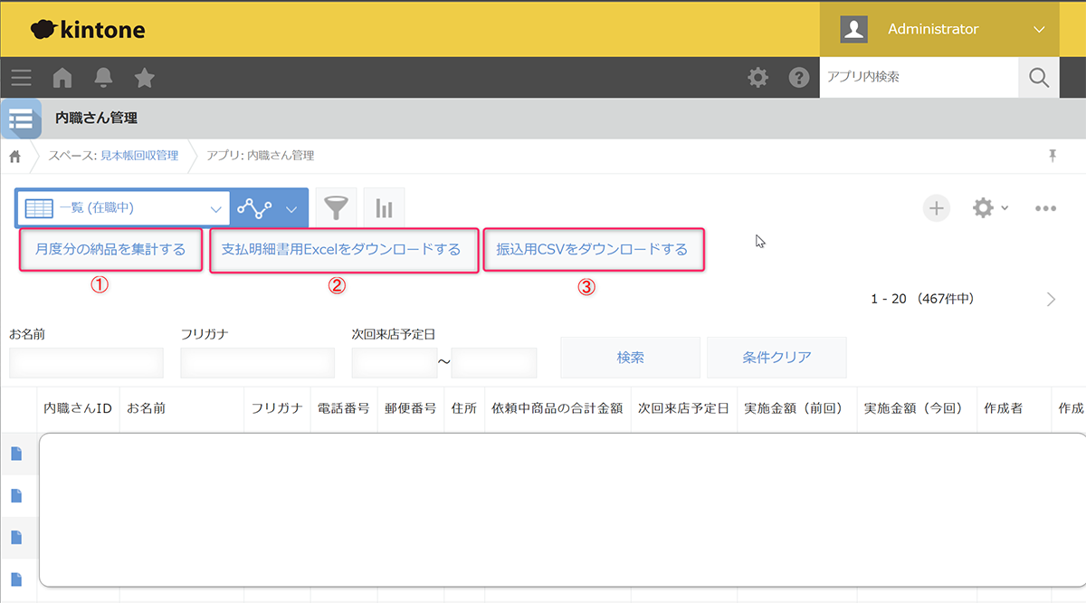 内職さん管理は「月の支払額の集計」や「支払明細書の生成」「銀行振込用のCSVファイルのダウンロード」も可能です。アプリ上部にある「月度分の納品を集計する」などのボタンを押すだけで集計とダウンロード用ファイルの生成が行われます。ダウンロードした支払明細書は印刷して手作業パートナーに渡します。報酬の支払時には銀行振込用のCSVファイルを使って効率的に支払い処理を行えます。